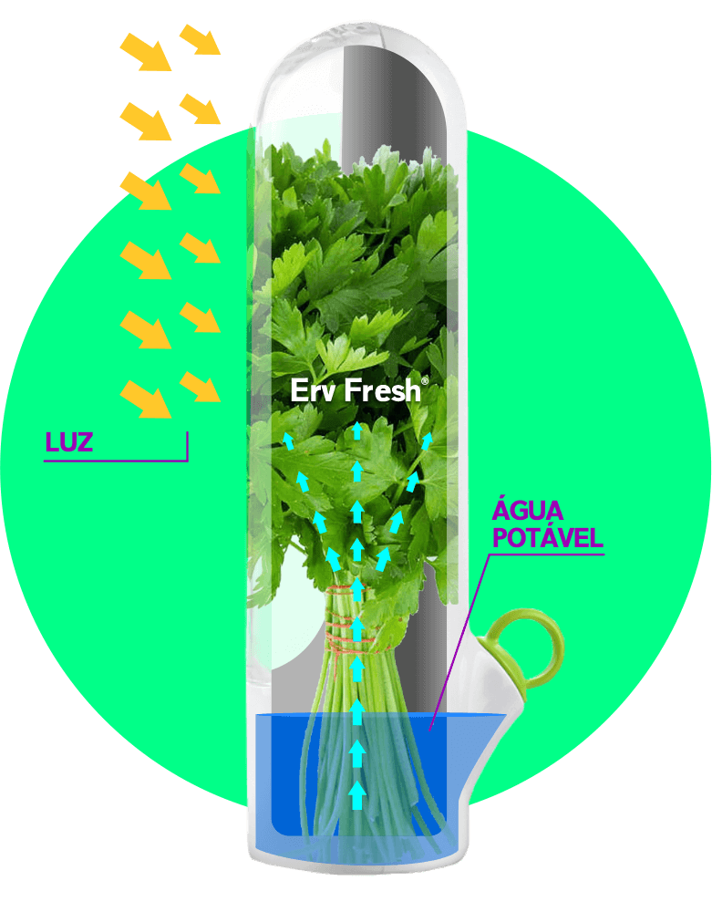 A cápsula do Erv Fresh é projetada especialmente para que a água potável penetre pelo caule fazendo com que seu condimento fique hidratando e não percam suas vitaminas e minerais, mantendo o valor nutricional e também manter fresco por muitos dias, para isso indicamos que troque a água a cada 2 dias para manter seus condimentos frescos pelo máximo de tempo.